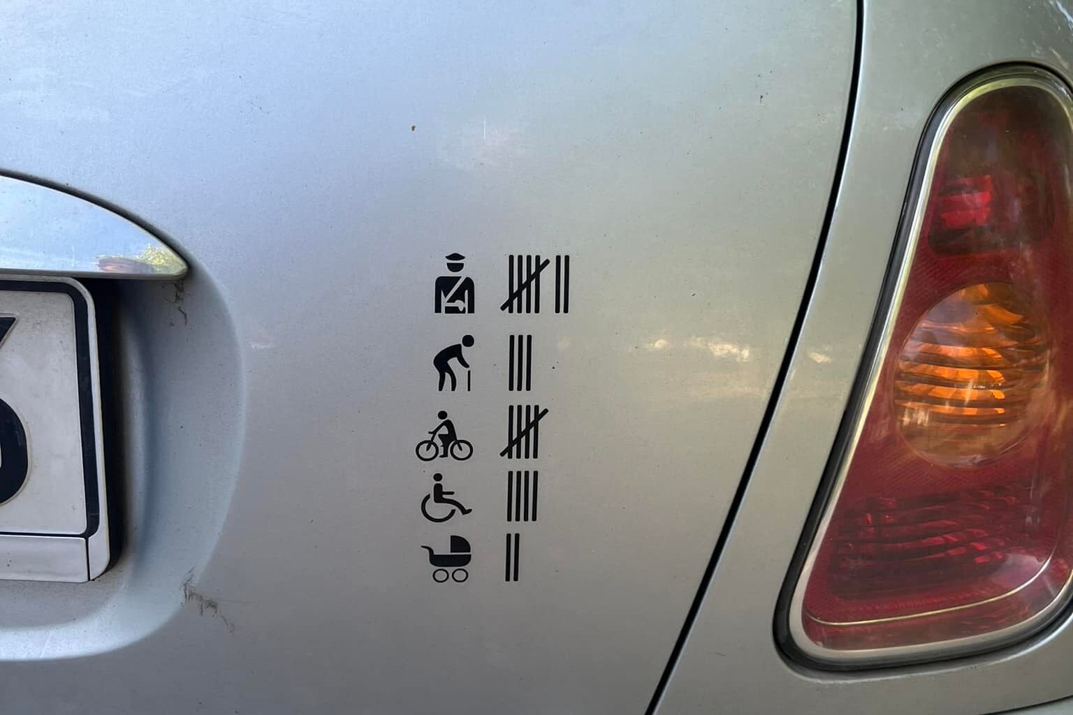 «У меня отличное чувство юмора, иногда я даже слишком много смеюсь, но, увидев эту наклейку на машине, я ничуть не рассмеялась», — написала она в социальных сетях, узнав смысл наклейки, на которой изображены символы полицейского, инвалида, пожилого человека, велосипедиста и детской коляски. Напротив каждого символа нанесены чёрточки, по всей видимости, обозначающие количество сбитых людей из этой группы.