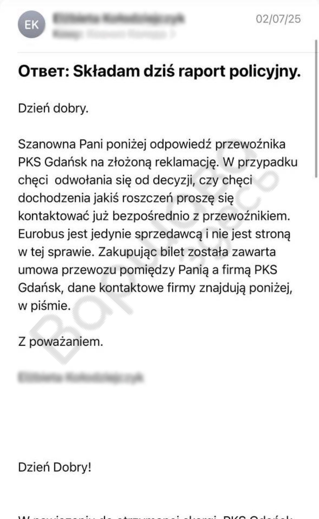 На электронные письма автобусный перевозчик не отвечает по сей день. Мэрия Гданьска, куда Ксения обратилась также, посоветовала обращаться к перевозчику. Спустя 2 недели ответила фирма посредник, где были куплены билеты, сообщив, что перевозчиком была проведена беседа с водителями. По их словам, у Ксении не было билетов и от неё пахло алкоголем, якобы поэтому её отказались брать на рейс. Кроме того, Ксении пригрозили уголовным делом, если она продолжит писать в различные инстанции.