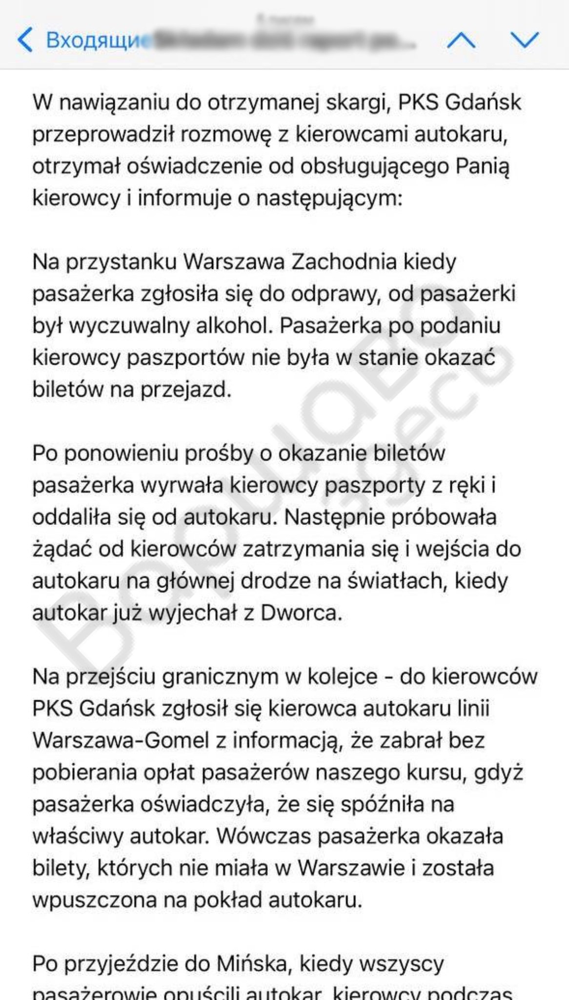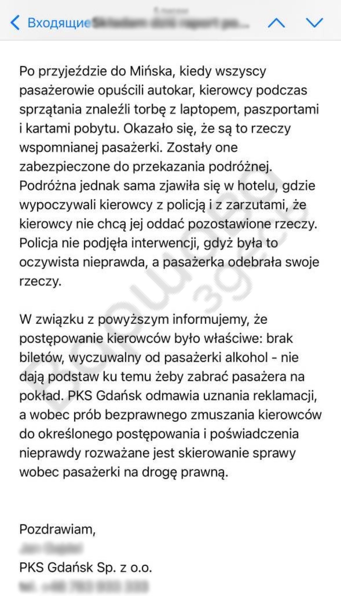 К нам в редакцию обратилась Ксения — белоруска, проживающая в Португалии. 10 июня женщина с 3-мя детьми возвращалась через Польшу на родину в отпуск, купив билеты на автобус Гданьск-Минск, осуществляемый компанией PKS Gdańsk.