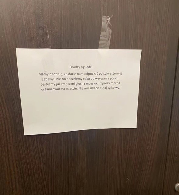 Для многих Новый год — это время шумных празднований и гуляний. Но не всем нравится слушать громкую музыку веселящихся соседей. В ТикТоке появилась публикация фотографии записки, которую оставили жильцам многоквартирного дома в Польше. В записке соседи просят соблюдать тишину в новогоднюю ночь.