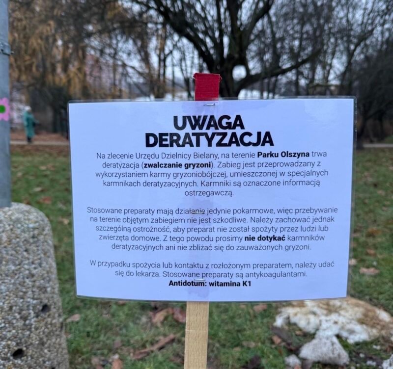 Жители Белян стали сообщать в соцсетях о крысином яде, разбросанный по газонам в парке Olszyna. «По всему парку установлены десятки приманок для крыс, но ядовитое вещество также разбросано прямо на земле, в местах, доступных собакам, птицам, ежам и другим животным», — говорит одна из жительниц.