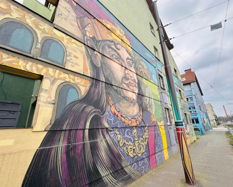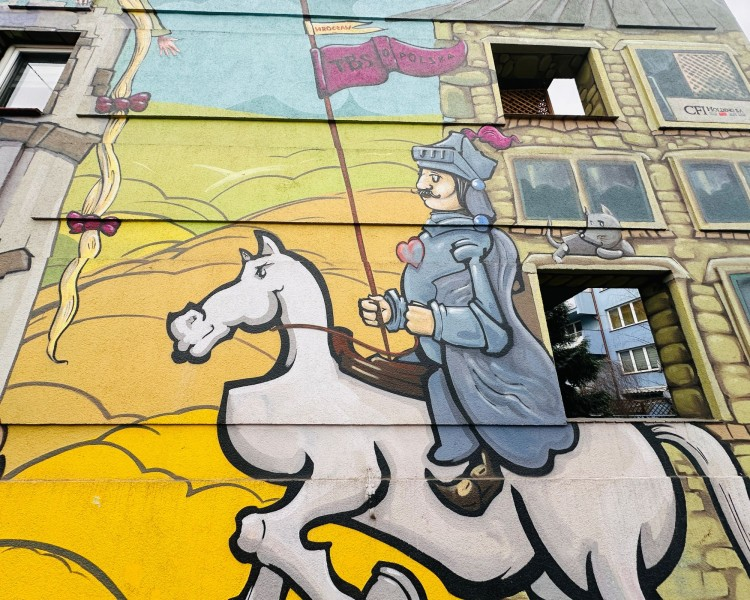 - Король — основным мотивом этой фрески была отсылка к отелю «Król Kazimierz,», расположенному в Kazimierzu Dolnym. Фигуру короля Казимира II Справедливого авторы представили в сказочном образе. Правитель внимательно наблюдает за романтической сценой прибытия рыцаря к заточенной в башне принцессе.