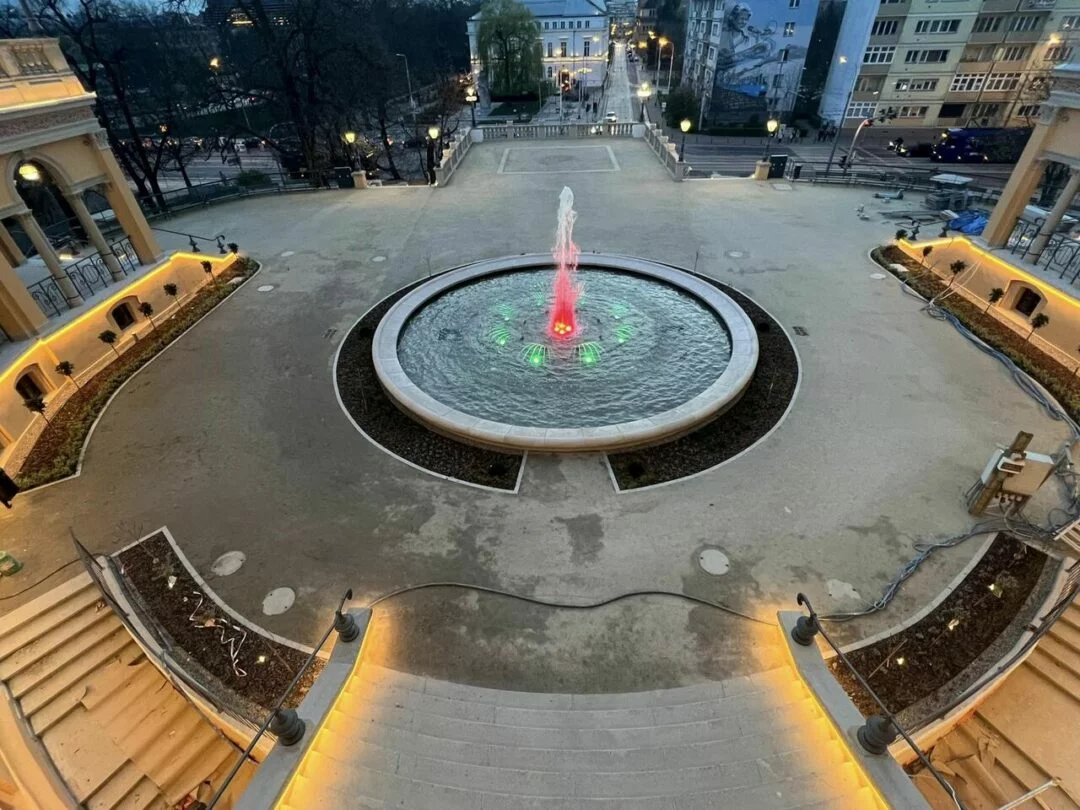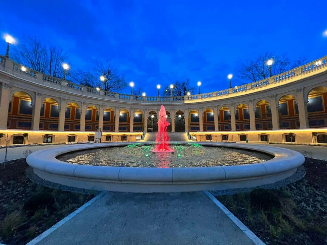В настоящее время проводится проверка освещения: фонтан с цветами радуги, 56 уличных фонарей, 14 бра на стенах колоннады, 430 погонных метров светодиодных лент.