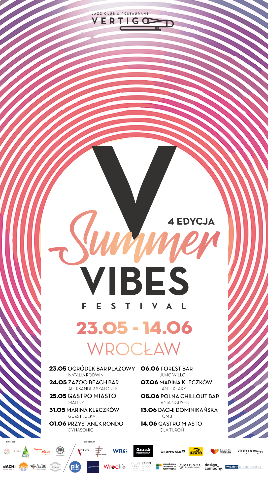 Vertigo Summer Vibes Festival — летний фестиваль, продвигающий молодых вроцлавских артистов и места в городском пространстве. 10 уникальных концертов альтернативной, поп-, рок-, фанк- и соул-музыки.