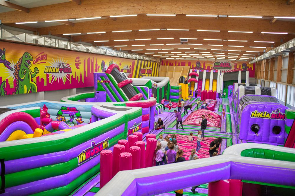Объект занимает площадь 2,5 тысячи квадратных метров и предлагает разнообразные развлечения. Внутри вы найдете площадку для игры в вышибалы, бассейны с губкой, вышку для прыжков и множеством других развлечений.