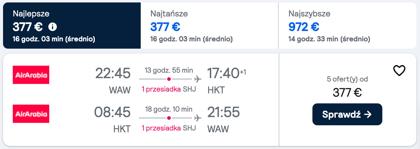 Авиакомпания Air Arabia (ОАЭ) снизила цены по многим направлениям. Недорогие билеты можно найти из Польши в Бангкок или на Пхукет. Самые низкие цены на сентябрь-ноябрь 2025. В минимальный тариф включены только ручная кладь.