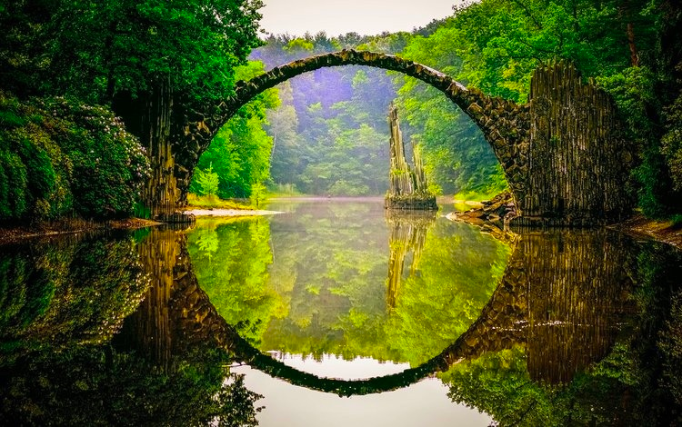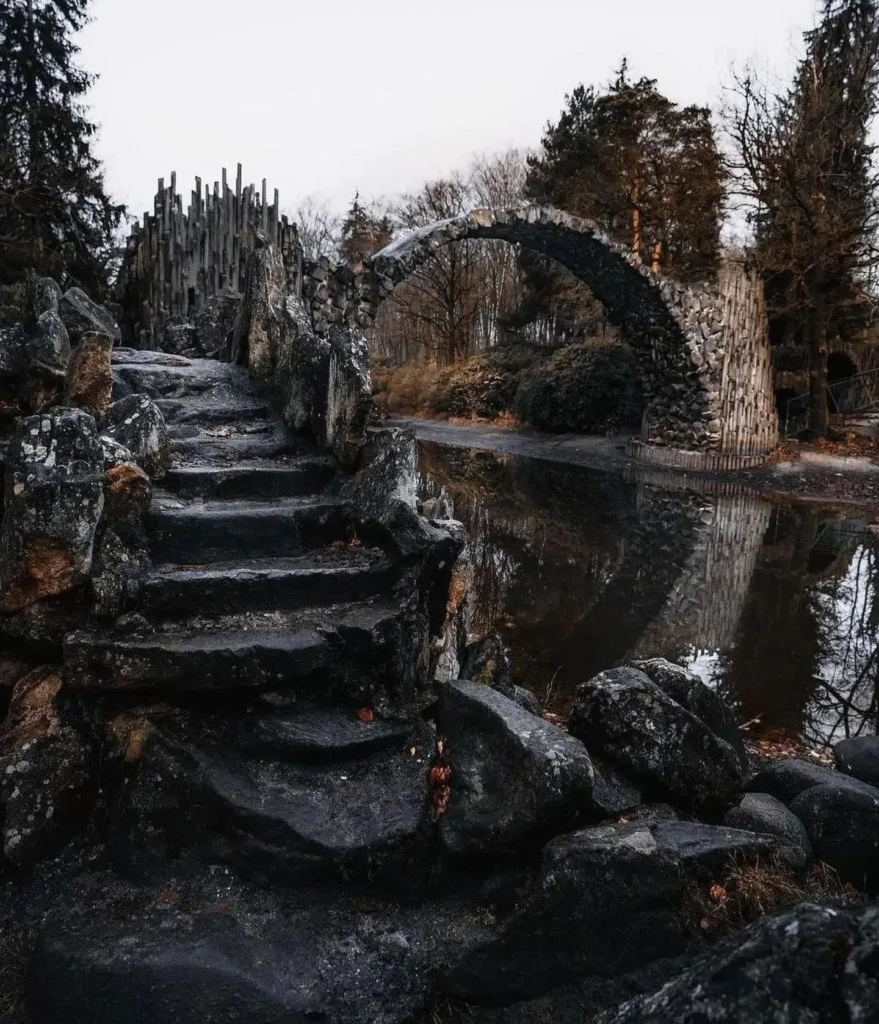 Мост расположен на территории ландшафтного парка площадью 200 га, в котором растут пышные рододендроны и азалии. Постоянная смена образа пейзажа завораживает в любое время года. Исторические постройки, такие как мост Ракотцбрюке, Кавалерийский дом и усадебный замок, придают парковому комплексу, созданному помещиком Германом Рётшке в 1844 году, особое очарование. В дворце находятся гостиница и ресторан.