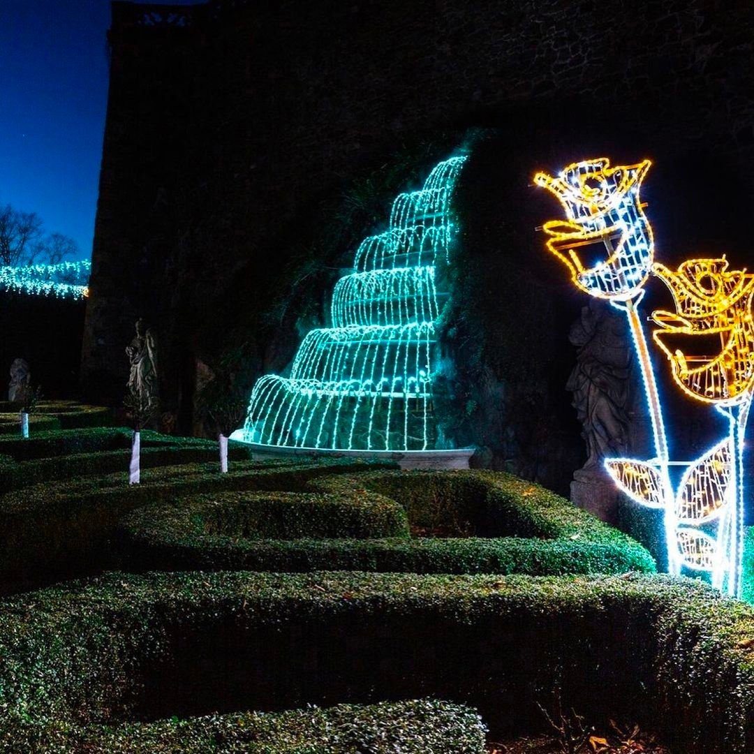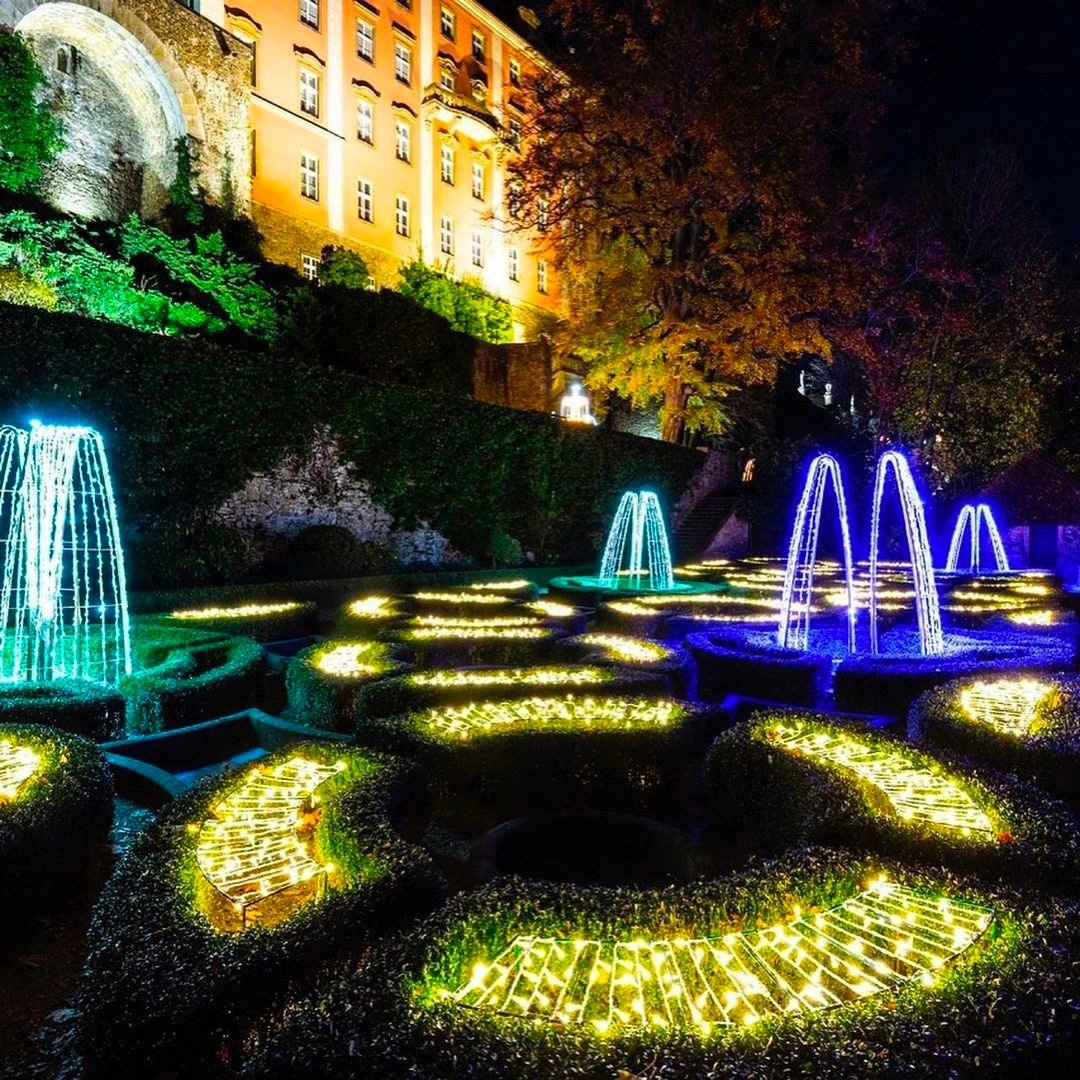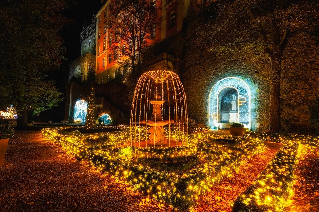 В Садах света вы увидите декорации, отсылающие к истории замка и замковой жизни, в том числе: фигуры на княжеском балу, иллюминация на многочисленных фонтанах и рыцарский поединок. Сады света замка Ксёнж — идеальный вариант для зимних вечеров, например, романтической прогулки или места для семейного путешествия.