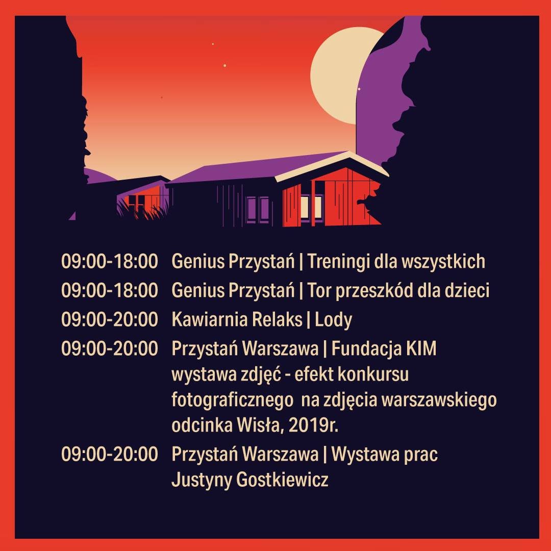Przystań Warszawa – уникальный культурно-развлекательный комплекс в скандинавском стиле, расположенный на берегу Вислы. Комплекс из семи одноэтажных зданий, в котором расположится множество занятий по интересам и развлечений. Каждую неделю в комплексе будут проходить вернисажи, перформансы и мастер-классы.