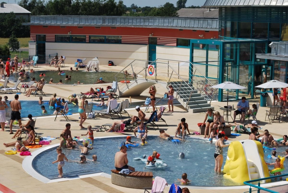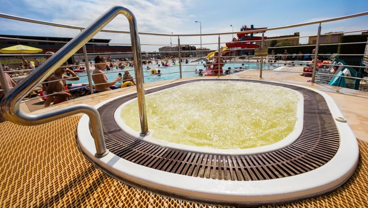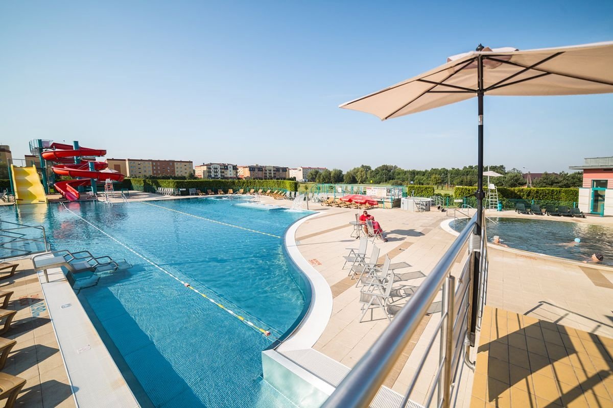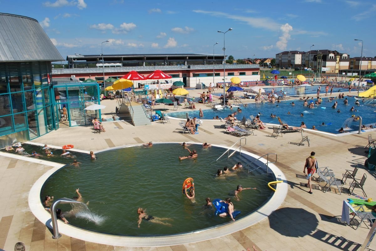 Комплекс включает пять бассейнов: два круглогодичных термальных, рекреационного, спортивного и детского. Бассейн порадует любителей водного отдыха разнообразными аттракционами: настенные гидромассажные форсунки, искусственная река с быстрым течением, гидромассажные струи для шеи, воздушные гейзеры, аэрационные скамейки и шезлонги.