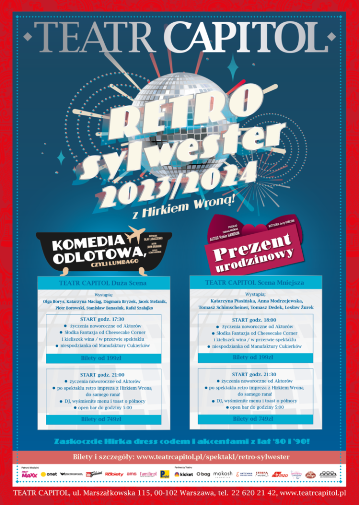 Teatr & Klub Capitol приглашает вас встретить Новый год с культовым спектаклем «Hirkiem Wroną». Бравурная комедия, звёздный состав, бесчисленные тосты и громкие аплодисменты — так вы встретити Новый год в самом сердце столицы. Также будут показаны спектакли „Prezent urodzinowy”, „Komedia odlotowa, czyli lumbago” и „Następnego dnia rano„. После выступлений вас ждёт новогодняя вечеринка, насыщенная лучшими хитами последних десятилетий. DJ Hirek Wrona создаст потрясающую атмосферу, зажигая золотые времена MTV и воссоздавая мир, который больше не существует. Вы сможете насладиться профессиональным обслуживанием и вкусным меню, созданным шеф-поваром Teatr & Klub Capitol. Погрузитесь в неповторимую атмосферу 80-х и 90-х годов, которая наполнит ваше празднование особенным весельем и волнением.