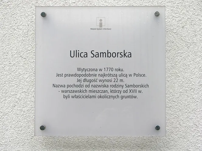 Улица Samborska расположена в Новом Городе Варшавы. Она была заложена около 1770 года. Её название происходит от имени Самборских, владельцев окрестных земель, варшавских бюргеров. На довоенных картах Варшавы это тупиковая улица, уходящая немного дальше, чем сегодня, в сторону Вислы. После войны её укоротили.